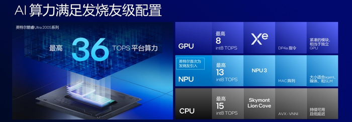 除此之外,英特尔也为桌面端处理器首次引入了 AI 计算单元 ——NPU。CPU 部分最高可提供 15 TOPS 的算力,GPU 部分最高 8 TOPS 算力,NPU 部分最高则可提供 13 TOPS 的算力。