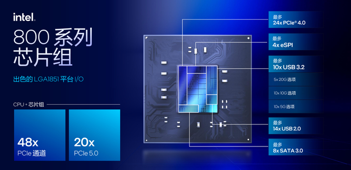 英特尔这次启用了全新的 800 系列芯片组,也就是说处理器需要搭配 800 芯片组的主板一起使用,既标志着延续三代的 700 系列芯片组成为过去,也预示着酷睿 Ultra 200 系列面向未来的野心。