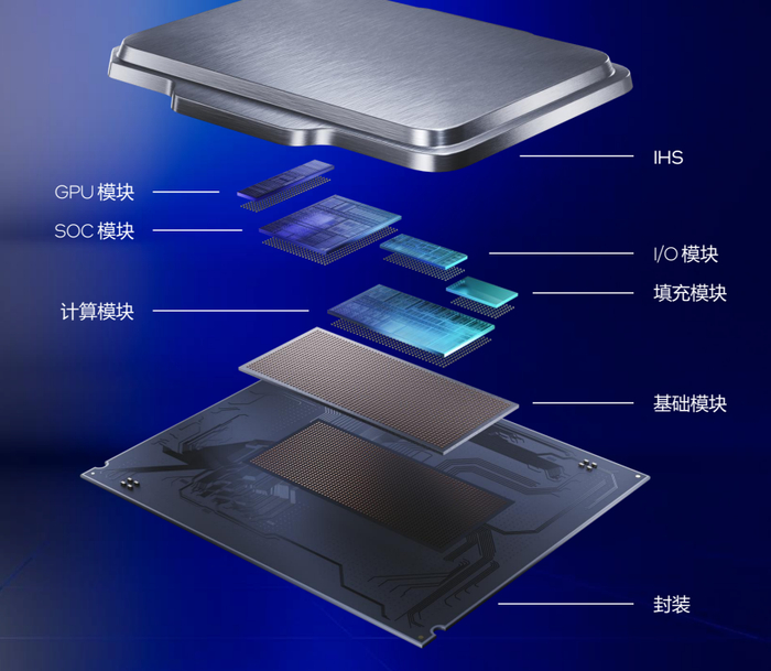 桌面端酷睿 Ultra 200 系列处理器代号为 Arrwow Lake,在上一代 14 代酷睿处理器上,英特尔将 CPU 计算单元、内存控制器和周边总线等集成在一整块 Die 上,但是这次 Ultra 9 285K 却划分成了很多小区域,而且将 GPU 模块、SOC 模块和 I/O 模块都加了进来,它们都拥有独立的核心,也就是 Tile,所有的 Tile 又都整合在一块完整的基础模块上。