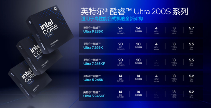 英特尔这次首发的酷睿 Ultra 200 系列桌面级 CPU 一共有 5 款型号,其中 i9 有一款,i7 有两款,i5 有两款。i7 和 i5 提供无核显 F 版本,i9 则没有。