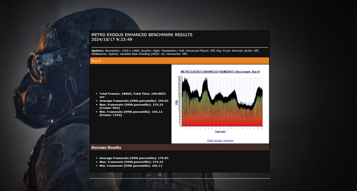 第二款是《地铁:逃离》,选择 1080P 分辨率 + 高画质预设运行游戏自带基准测试: