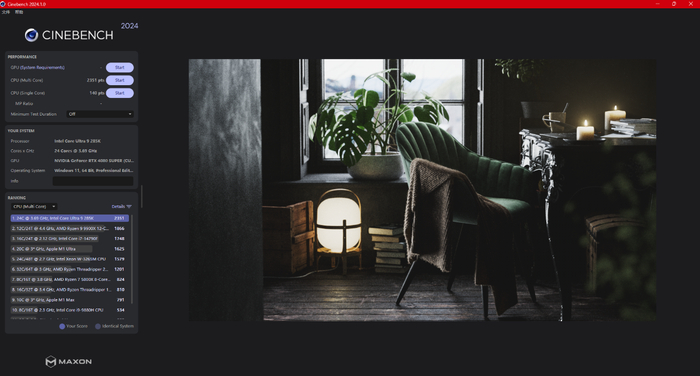这次我们也加测了 CineBench 2024 的表现,酷睿 Ultra 9 285K 获得了单核 140 分,多核 2351 分的成绩。