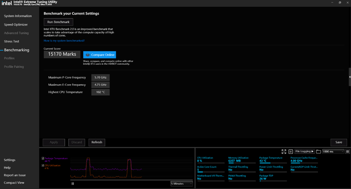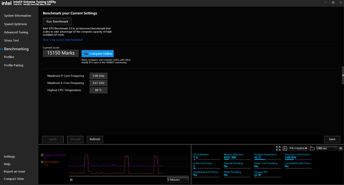 在关闭 / 打开一键智能超频按钮的前后,使用 XTU 内置的跑分工具测试,总分由 15150 提升到 15170,涨了 20 分。