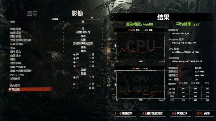 接下来是 3A 单机游戏,第一款《古墓丽影:暗影》,选择 1080P 分辨率 + 高画质运行游戏自带基准测试: