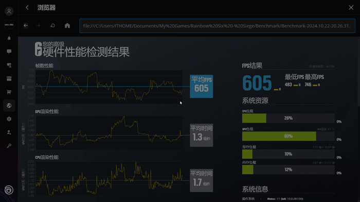 第二款是《彩虹六号:围攻》,以 1080P 分辨率 + 高画质运行游戏自带基准测试工具: