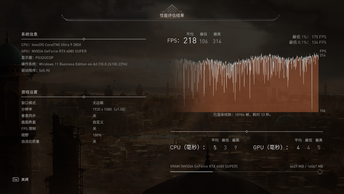 酷睿 Ultra 9 285K 游戏平均帧数为 218 帧,1% Low 帧 175 帧;