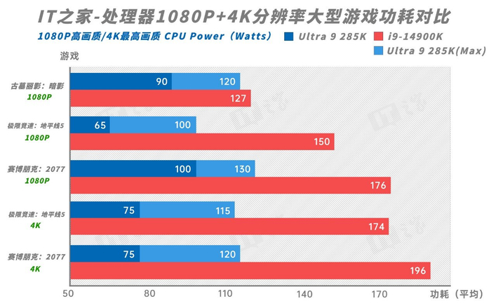 别急,在测试游戏的过程中,另一个细节引起了我们的注意。那就是酷睿 Ultra 9 285K 的游戏功耗相比 i9-14900K 大幅下降,几乎是一骑绝尘般的领先。在 1080P 分辨率下,通常我们都不会打开光追、DLSS 等依靠显卡技术的选项,来评估 CPU 的游戏性能。此时的酷睿 Ultra 9 285K 功耗表现就已经非常惊人了,为此我们也做了一个图表,从图中不难看到: