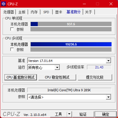 酷睿 Ultra 9 285K 单核 2289 分,多核 41355 分;