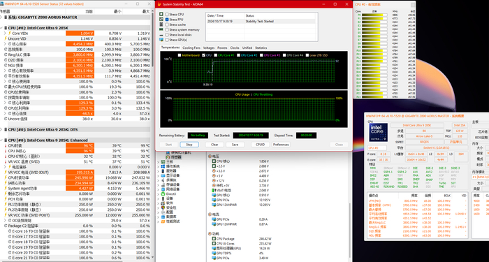 先看烤机表现,酷睿 Ultra 9 285K 从一开始就稳定在了 250W 功耗附近,因此可以看到 CPU 温度几乎是一瞬间从 40° 左右上升到 90° 以上,但没有出现以往 i9 处理器那种前几十秒温度直接破百,CPU 功耗波动也很大的情况。20 分钟烤机后 CPU 最高温度为 99°,平均温度很快就稳定在 92°-96° 之间,CPU 功耗略有下降稳定在了 245W 左右,P 核主频最高 4.8GHz,最低 4.75GHz,E 核主频则在 4.1GHz 左右。