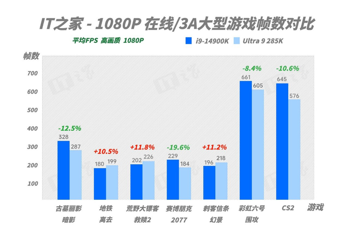 从测试结果来看,酷睿 Ultra 9 285K 和 i9-14900K 的游戏表现互有胜负,双方都没有绝对的优势,i9-14900K 在线上竞技游戏中优势较大,而 3A 游戏上酷睿 Ultra 9 285K 更有实力。不过,如果仅仅是这样的表现,似乎有点过于普通了。
