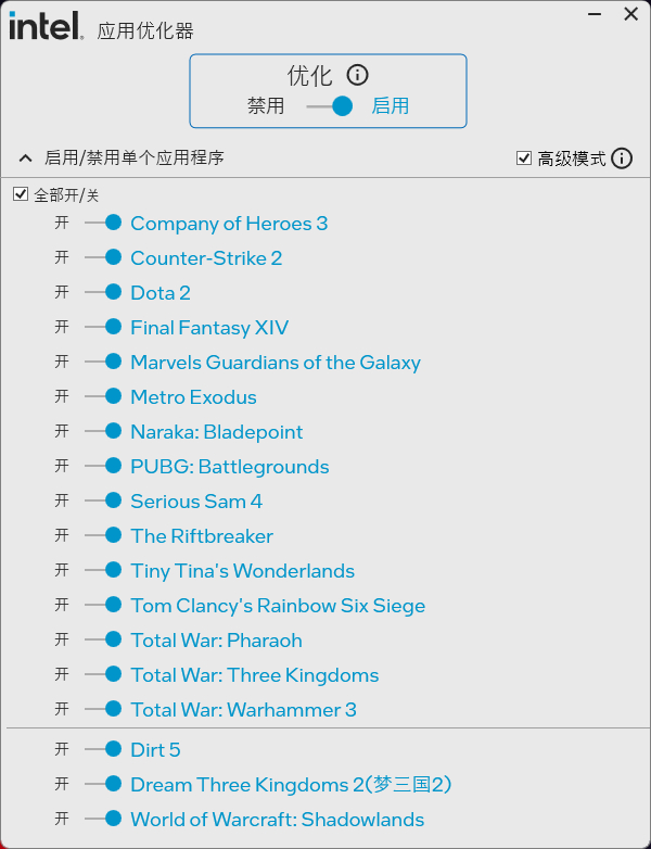打开 APO 之后,里面支持的游戏数量不少,既有《CS2》、《DOTA 2》、《PUBG》、《彩虹六号:围攻》这样的在线竞技游戏,也有《地铁:逃离》、《全面战争:三国》这样的 3A 单机游戏。上述游戏大家可以重点关注一下。游戏实测环节均采用 1080P 分辨率 + 高画质进行,部分游戏有参数调整的会单独说明。
