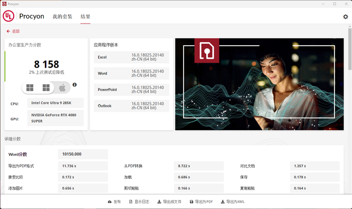 在考验文档办公综合能力的 UL Procyon 办公室生产力测试中,酷睿 Ultra 9 285K 的: