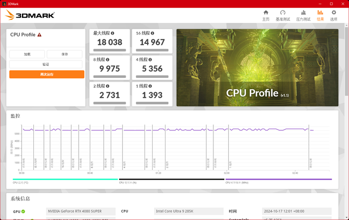 酷睿 Ultra 9 285K 最大线程分数为 18038 分,单线程分数 1393 分;