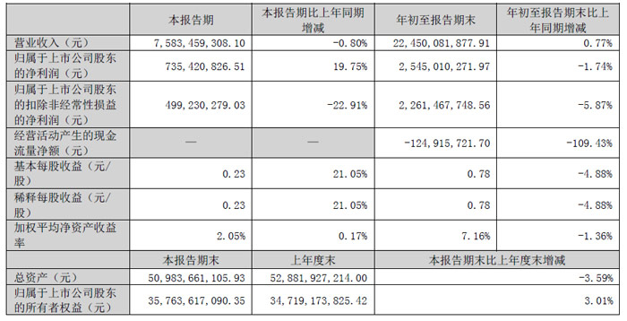 第三季度实现营业总收入75.83亿元,同比下降0.80%;归母净利润7.35亿元,同比增长19.75%;扣非净利润4.99亿元,同比下降22.91%。