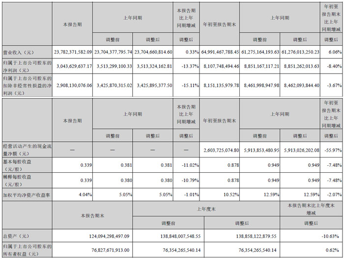 其中,第三季度实现营收237.82亿元,同比增长0.33%;归属于上市公司股东的净利润30.44亿元,同比下降13.37%;扣非净利润29.08亿元,同比下降15.11%;基本每股收益0.339元。