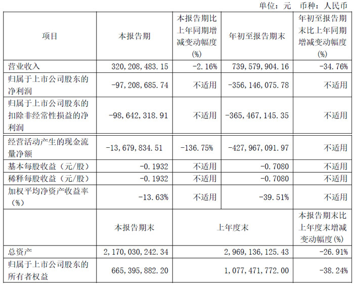 第三季度实现营收3.2亿元,同比下降2.16%;归母净利润亏损9720.87万元,扣非净利润亏损9864.23万元。