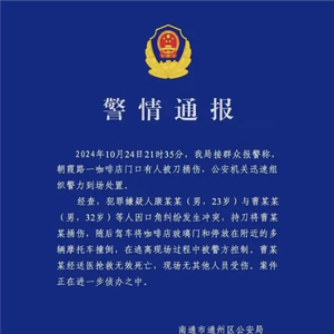 随后官方进行了通报,经查,犯罪嫌疑人康某某(男,23岁)与曹某某(男,32岁)等人因口角纠纷发生冲突,持刀将曹某某捅伤,随后驾车将咖啡店玻璃门和停放在附近的多辆摩托车撞倒,在逃离现场过程中被警方控制。曹某某经送医抢救无效死亡,现场无其他人员受伤。案件正在进一步侦办之中。