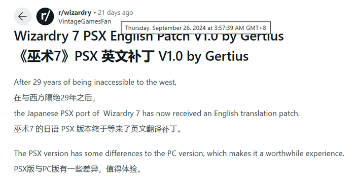 直到今年9月,欧美玩家才在时隔29年之后终于等来了日版《巫术7》的英文补丁。