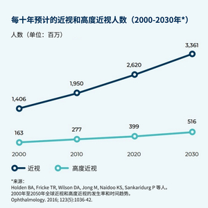 根据世界卫生组织(WHO)的数据,2020年全球近视人数约有26亿,预计到2030年将增加到34亿,全球三分之一的儿童和青少年受到近视影响。