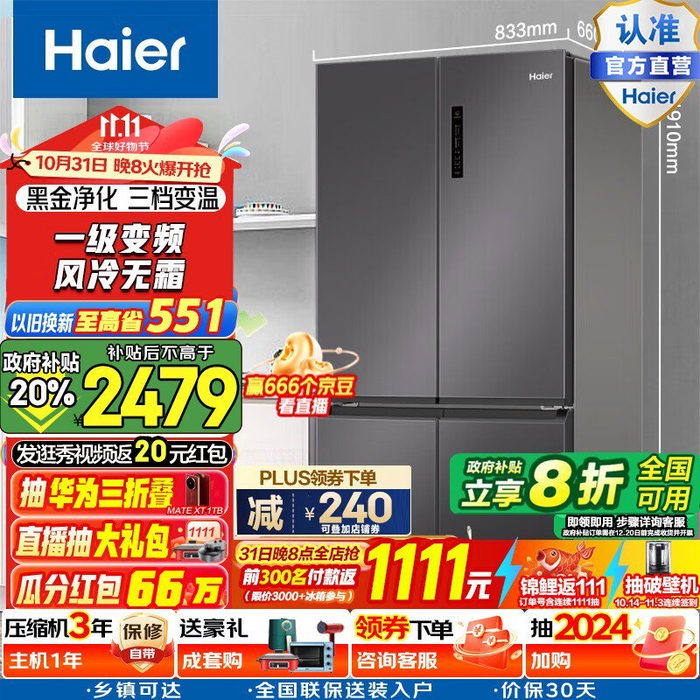 海尔500升十字对开双开门电冰箱优惠价格2219元