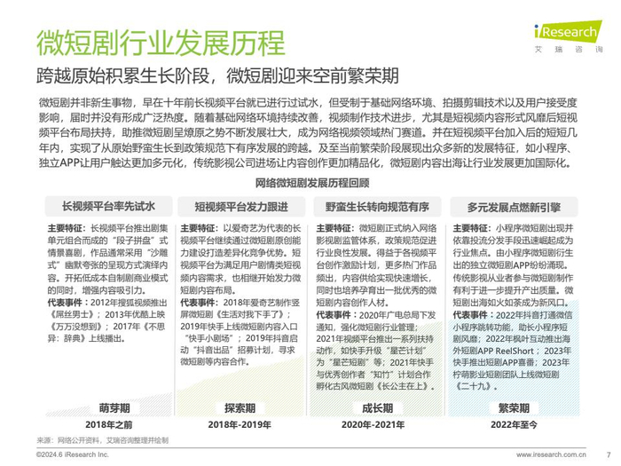 微短剧并非新生事物,早在十年前长视频平台就已进行过试水,但受制于基础网络环境、拍摄剪辑技术以及用户接受度 影响,届时并没有形成广泛热度。随着基础网络环境持续改善,视频制作技术进步,尤其是短视频内容形式风靡后短视 频平台布局扶持,助推微短剧呈燎原之势不断发展壮大,成为网络视频领域热门赛道。并在短视频平台加入后的短短几 年内,实现了从原始野蛮生长到政策规范下有序发展的跨越。及至当前繁荣阶段展现出众多新的发展特征,如小程序、 独立APP让用户触达更加多元化,传统影视公司进场让内容创作更加精品化,微短剧内容出海让行业发展更加国际化。