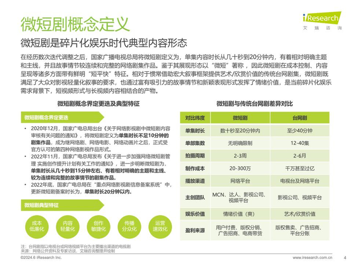 在经历数次迭代调整之后,国家广播电视总局将微短剧定义为,单集内容时长从几十秒到20分钟内,有着相对明确主题 和主线,并且故事情节较连续和完整的网络剧集作品。鉴于其展现形态以“微短”著称 ,因此微短剧在成本控制、内容 呈现等诸多方面带有鲜明“短平快”特征。相对于惯常借助宏大叙事框架提供艺术/欣赏价值的传统台网剧集,微短剧既 满足了大众对影视轻量化叙事的要求,也通过富有吸引力的故事情节和新颖表现形式发挥了情绪价值,是当前碎片化娱乐 需求背景下,短视频形式与长视频内容相结合的产物。