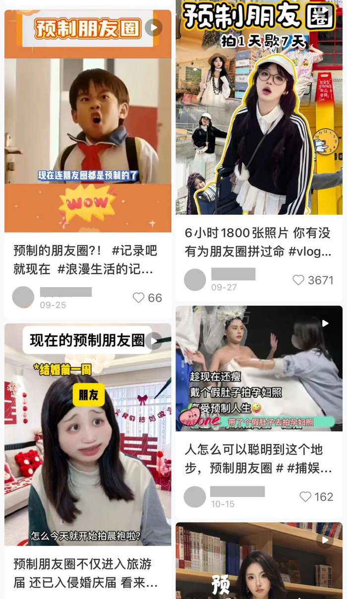 ● 小红书上“预制朋友圈”的相关搜索,图源@小红书