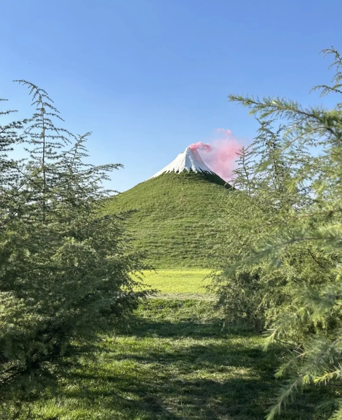 像这样的“人造景点”还有近来爆火的河北富士山。廊坊的宇宙思想乐园里有一座宇宙最大的人造火山——其实就是一个抹茶绿的小土包加上白顶。