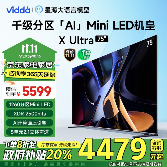Vidda X Ultra 75 英寸 海信电视 1260 分区 Mini LED 2500nit 4+64G