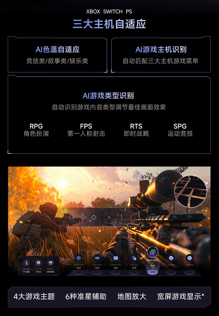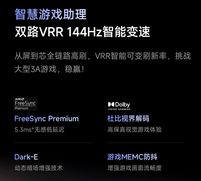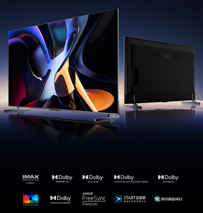 此外,这款电视还支持 AMD FreeSync Premium、杜比视界、游戏 MEMC 防抖、双路 144Hz VRR 等功能,支持 Xbox、Switch、PlayStation 三大主机自适应,通过 IMAX Enhanced 认证。