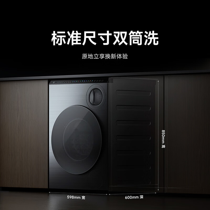 其尺寸为 598/600/850mm,体积与标准 10kg 滚筒洗衣机相当,可嵌入主流标准橱柜,双洗烘系统可同时工作,也可单独工作,双筒采用独立上下水结构,可避免进水交叉。
