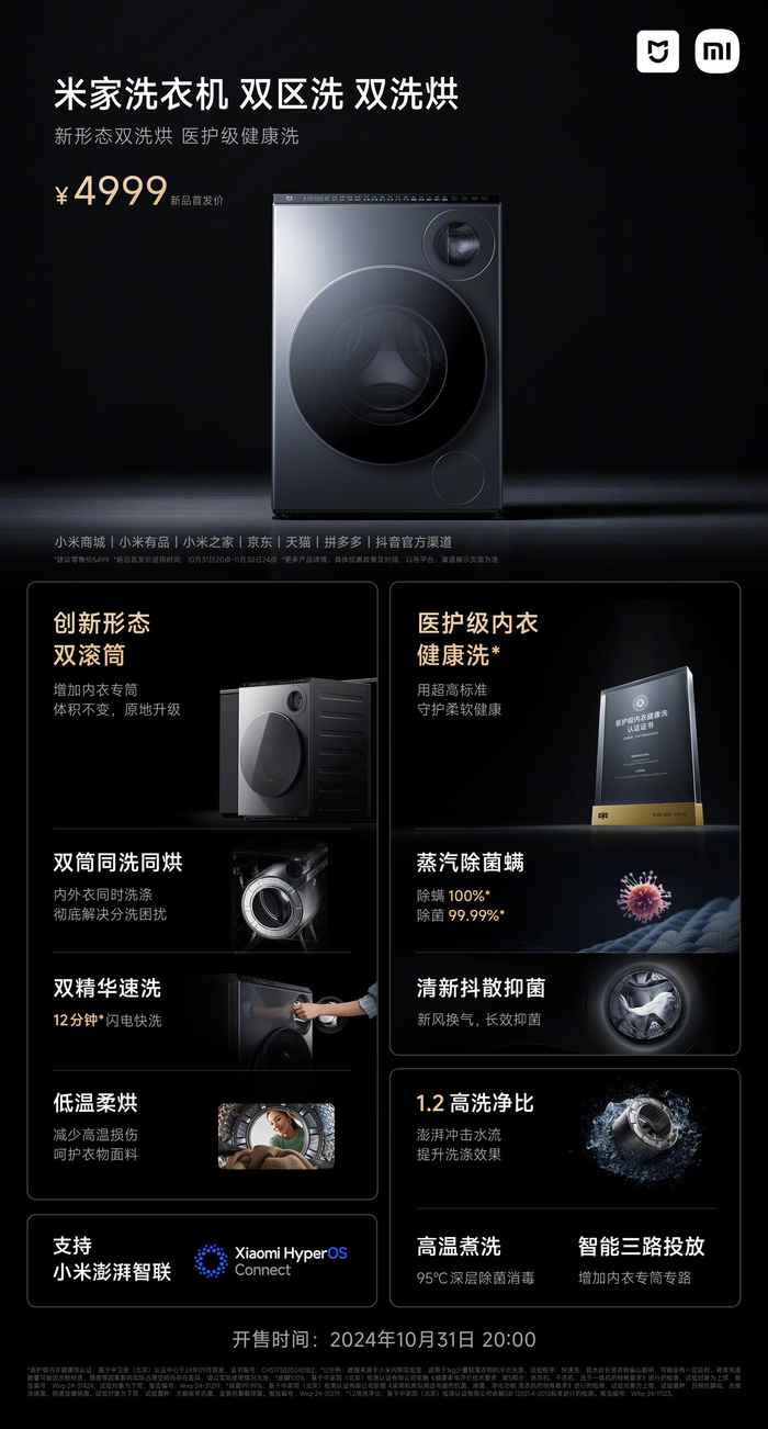 小米米家双区洗双洗烘洗衣机开售:内衣、外衣分开洗,4999 元