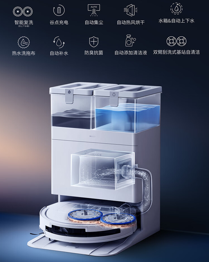 该扫拖一体机还支持“70° 热水洗布、45° 热风烘干、自动补水、自动集尘、智能复洗、全自动双臂刮洗、自动添加清洁液、14 天防臭防菌、节能谷点充电”等功能。