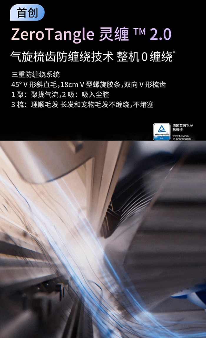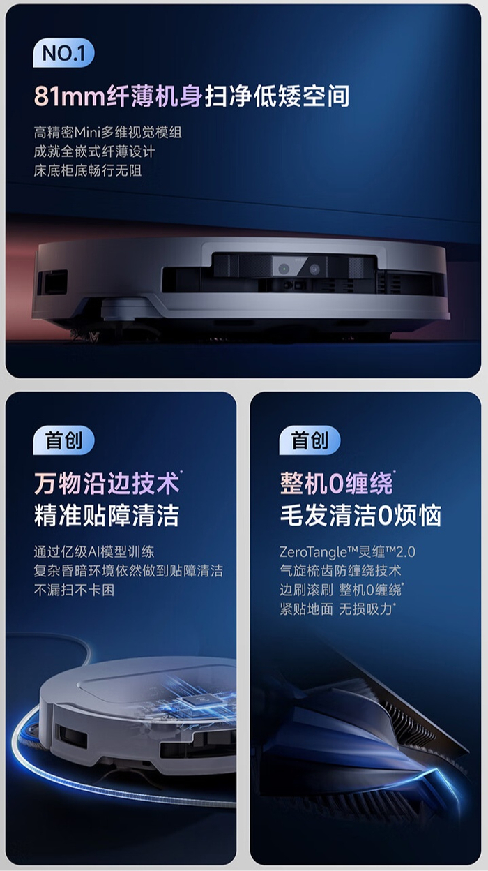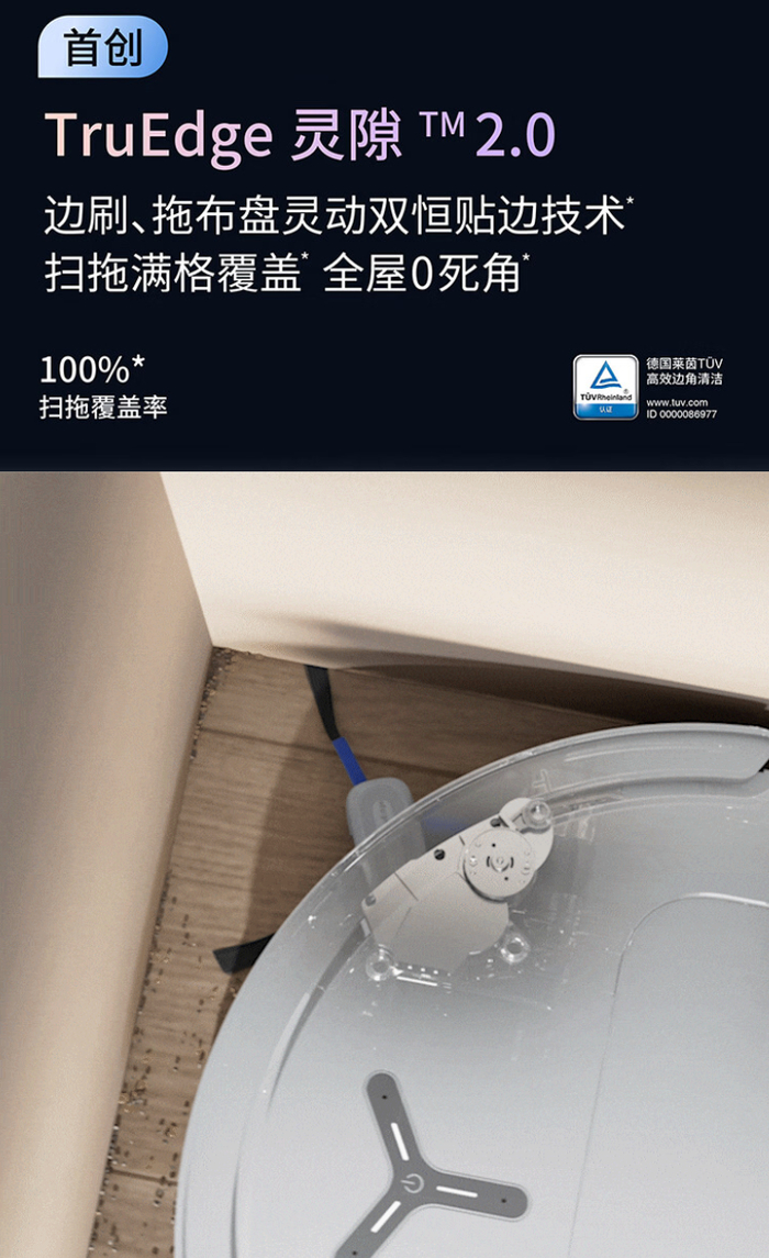 该款扫拖机器人拥有 15800Pa 吸力,内置“TruEdge 灵隙 2.0 技术”,官方宣称该技术可提升边角清扫能力,实现“100% 扫拖覆盖率”;机器人还搭载“ZeroTangle 灵缠 2.0 技术”,配备“45° V 形斜直毛 + 18cm V 型螺旋胶条”,支持毛发防缠特性。