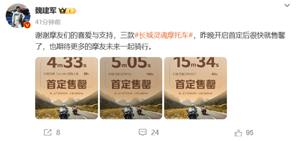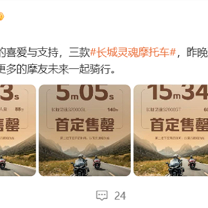 快科技11月1日消息,长城汽车董事长魏建军发布最新微博宣告了长城灵魂摩托首批的销售情况: