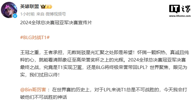 IT之家 11 月 2 日消息,《英雄联盟》2024 全球总决赛(S14)冠亚军决赛将于今日 22 点开战,由 LPL 赛区“全华班”BLG 战队对决 LCK 赛区 T1 战队。在此之前,《英雄联盟》官方公布了这场 BO5 比赛的宣传片。