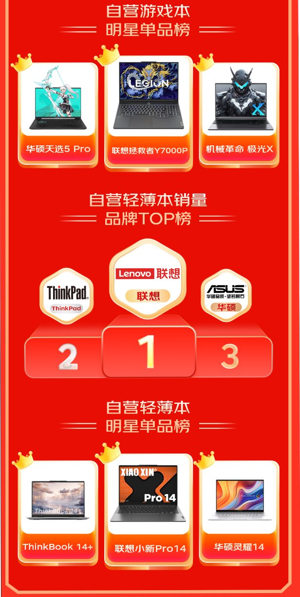 联想、华硕、ThinkPad因产品丰富、质量过硬等多种原因受到广大消费者青睐,成为京东11.11笔记本电脑总销量品牌前三名,上述品牌同时也包揽了自营销量品牌TOP前三名。今年京东11.11期间,京东将持续携手联想、华硕、ThinkPad、机械革命等大牌,以先人一步的新品购买体验,为广大用户带来更多物美价廉的笔记本电脑产品。
