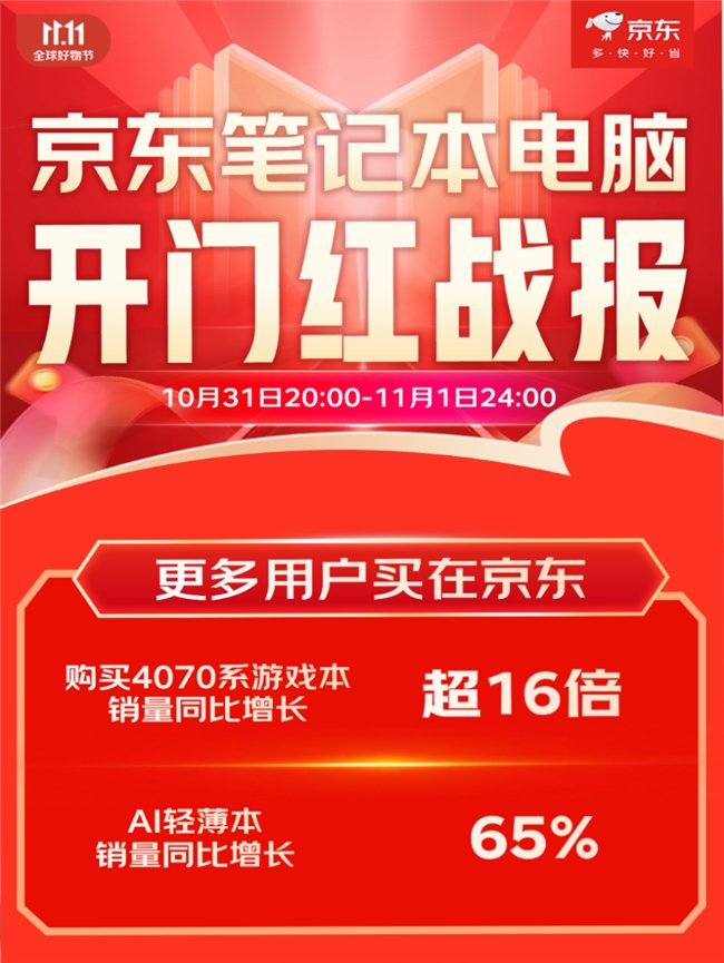 京东11.11笔记本电脑品类迎来开门红 4070系游戏本销量增长超16倍