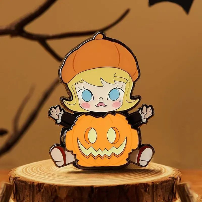 人气选手Labubu咧着九颗大牙,钻进南瓜,屁股一坐就是搪胶毛绒挂件。小画家Molly的贝雷帽换成了南瓜形状,做成徽章冰箱贴刚刚好。顶着棉花糖头发的害羞小男孩DIMOO变成了发光挂件,谁看了不哈特软软。