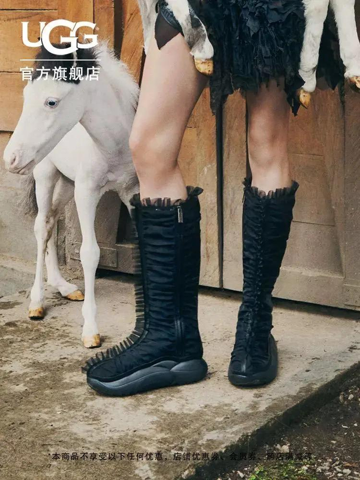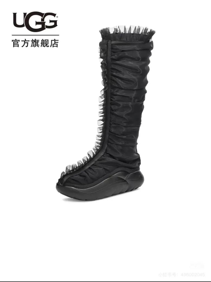 厚底流线鞋型很自然让人联想到缓震运动鞋,偏偏上面搭配了长款靴筒——还是蕾丝的?!这三个元素真的很难有什么关联吧!你的黑色蕾丝靴筒比较优雅,但你粗犷的鞋底又弥补了这一点。鞋面立起来的蕾丝更是令人费解,有点像古代士兵头盔上的红缨。UGG想创新的出发点是好的,但是你先别出发......
