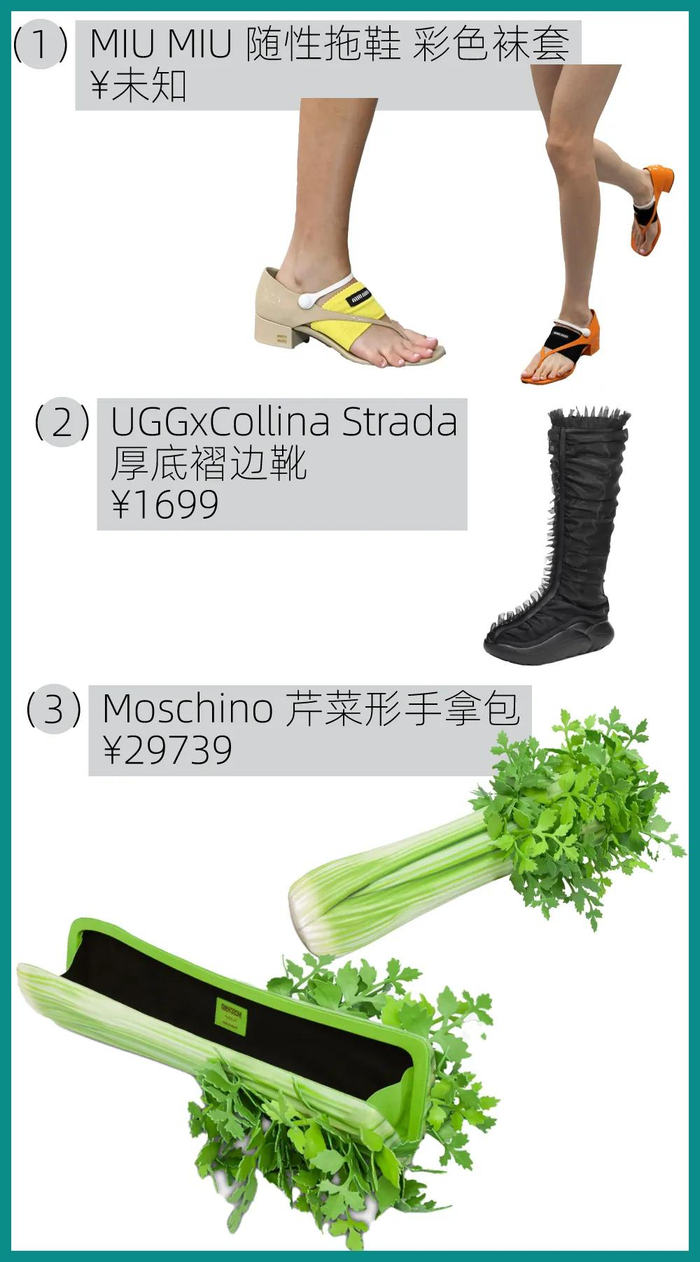 Moschino的产品以设计怪异著称,风格时常幽默俏皮,这我都了解,但这个芹菜也有点太抽象了吧?