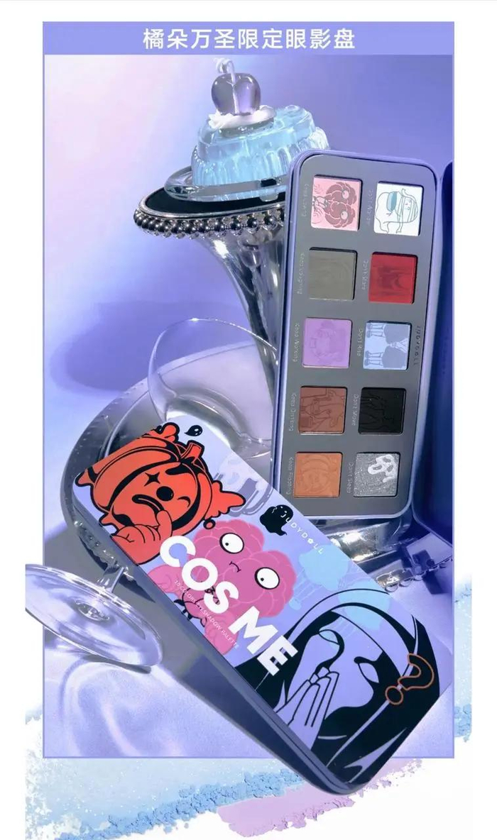 十个颜色,一组常规大地色,日常通勤依旧手拿把掐;一组玩妆高饱和色系是橘朵少见的风格:黑色、红色发色浓郁,一抹到位,气场全开。点睛之笔是镭射闪片,叠加盘中黑色,谁说甲方爸爸要的“五彩斑斓黑”不能做?