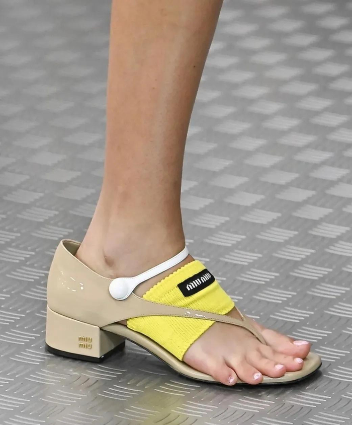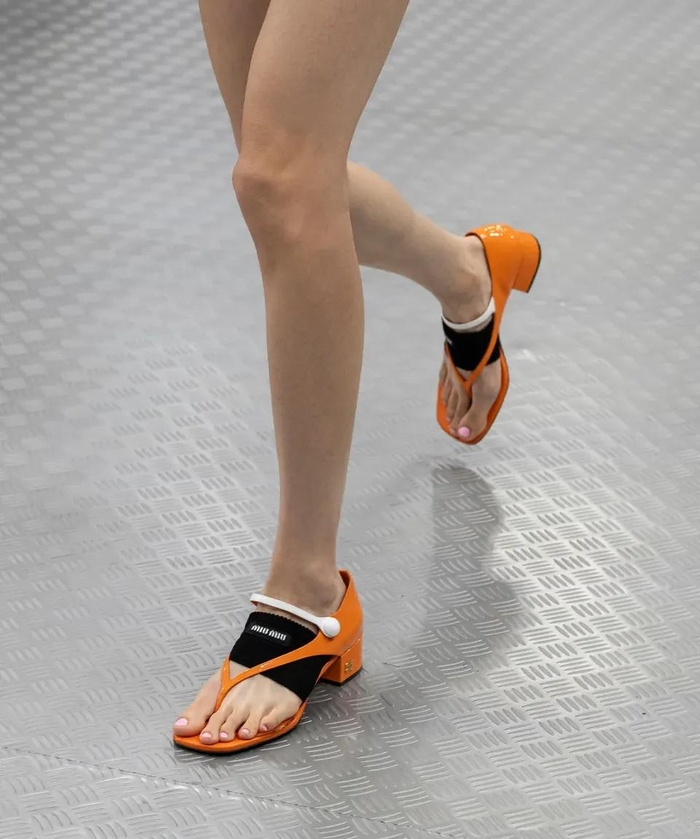 人字拖加了高跟,有种要松弛却还想绷住美丽的用力感,横亘在脚背的鞋扣防的是拖鞋滑还是高跟鞋崴脚,可能只有设计师可以解答。人字拖卡不卡脚指头不知道,不上不下的袜套倒是让强迫症很糟心,有种踩着减速带努力前行的感觉。