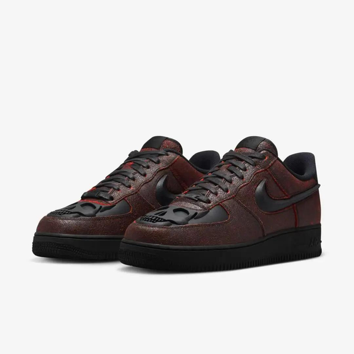 这次的节日限定主要以Air Force 1 Low 和Dunk Low两款经典鞋子作为基础,进行了配色和细节的调整。鞋面纹理做了斑驳的处理,鞋头增加了怪诞吸睛的骷髅浮雕元素,鞋侧的 Swoosh 设计立体到像死神手里的钩子,一上脚就是破土而出的鬼魅气质。