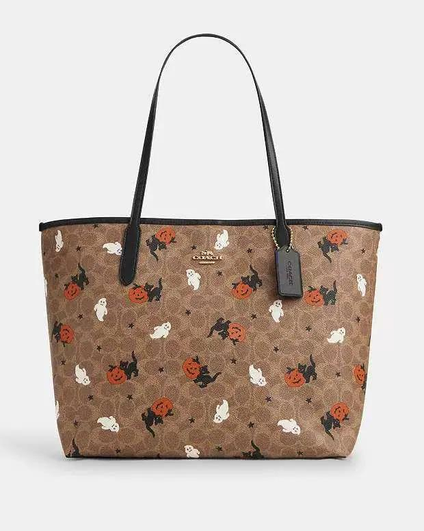这次推出了美版限定的万圣印花。咧嘴的南瓜,和南瓜亲密贴贴的黑猫,还有白色的胖幽灵到处飘,棕色皮面的托特包还有点呆萌。或许另一款更暗黑一点,弯月上有只被吓得发毛的黑猫,鬼面印花略显惊悚,这个才是真符合咱暗黑风磁场的包包。