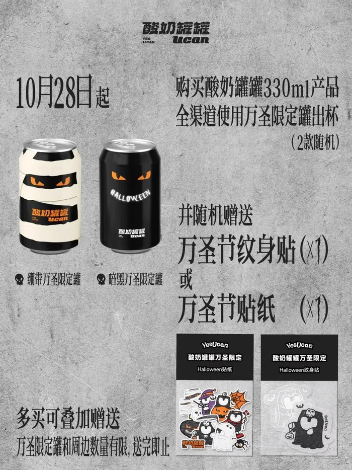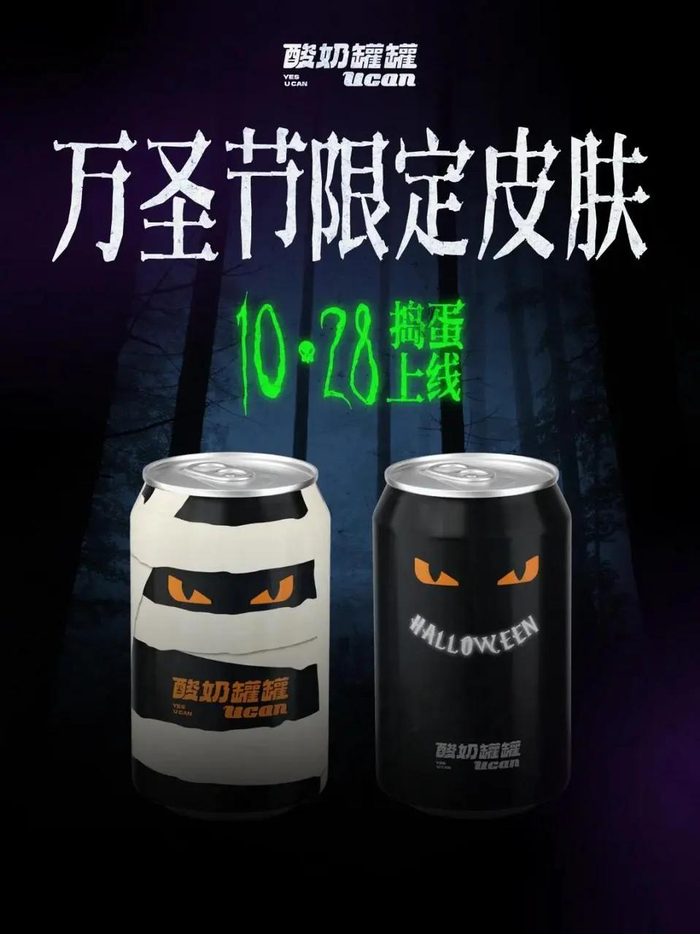 不过,平日主打天然小清新的酸奶罐罐,10月也狠狠“白切黑”了一把,推出了万圣节限定包装。罐身采用黑白色彩搭配与绷带元素,既暗黑,又带着一点奶凶奶凶的小俏皮。搭配吸睛的“邪恶南瓜”手提袋,美貌得简直可以作为cos出片时尚单品。