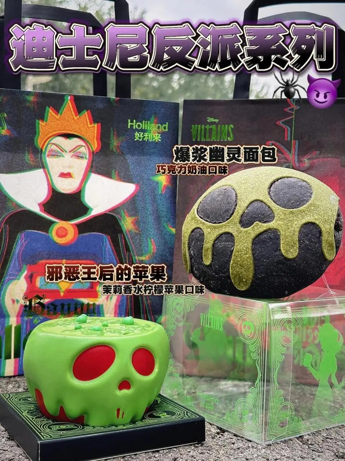 迪士尼反派系列持续发力,与好利来联名推出“邪恶王后的苹果”蛋糕与“爆浆幽灵”面包。浓郁暗黑风不仅要冲击视觉,更要向味蕾进攻。