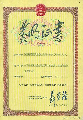 中国科学技术委员会颁发的“从包钢高炉渣制取稀土合金(硅铁还原法)”发明证书。