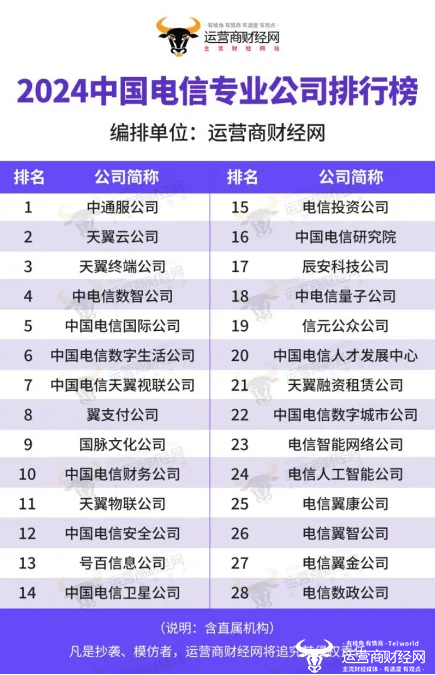 独家:2024中国电信专业公司排名曝光 中通服、天翼云、天翼终端排前三