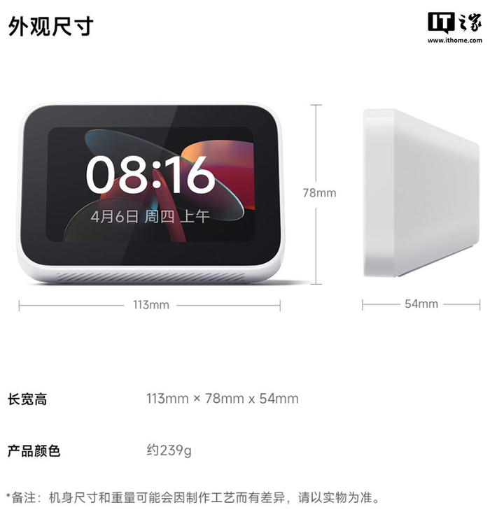 小米智能家庭屏 Mini 配备 3.97 英寸 800x480 分辨率全贴合屏,配备双频 Wi-Fi 和蓝牙 5.1,整机重量约 239g,IT之家附参数表如下: